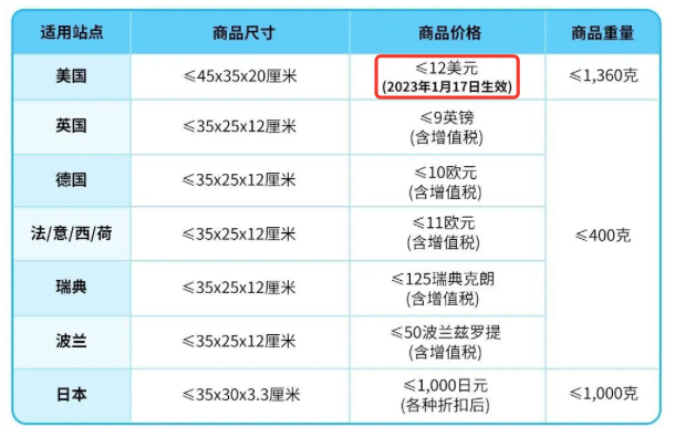 ·4、若卖家的产品未注册轻小商品计划,且价格低于10美元,则每件商品物流费用将减少约0.77美元,此外无需缴纳假日高峰配送费(2023年10月15日—2024年1月14日适用),同时继续享受快速的FBA履行速度。