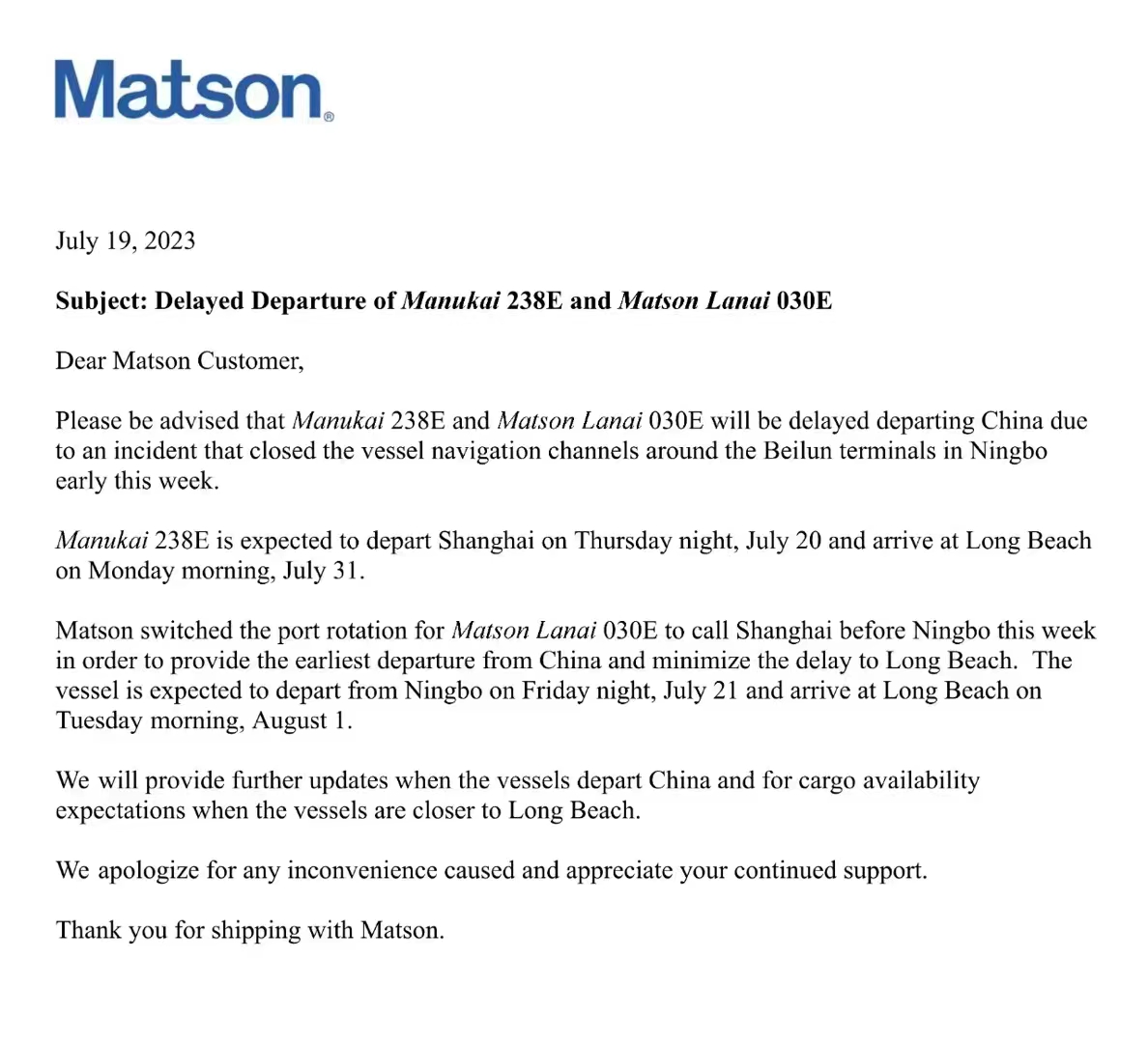 美森卡伊Manukai 238E预计7月20日(周四)晚从上海出发,7月31日(周一)上午抵达美国长滩港。同时为让美森拉奈Matson Lanai 030E更早的从中国驶离并尽早到达美国长滩港,美森已经将这条船挂靠港序改为上海 - 宁波 - 长滩港。 该船预计将于7月21日(周五)晚从宁波出发,8月1日(周二)上午抵达美国长滩港。