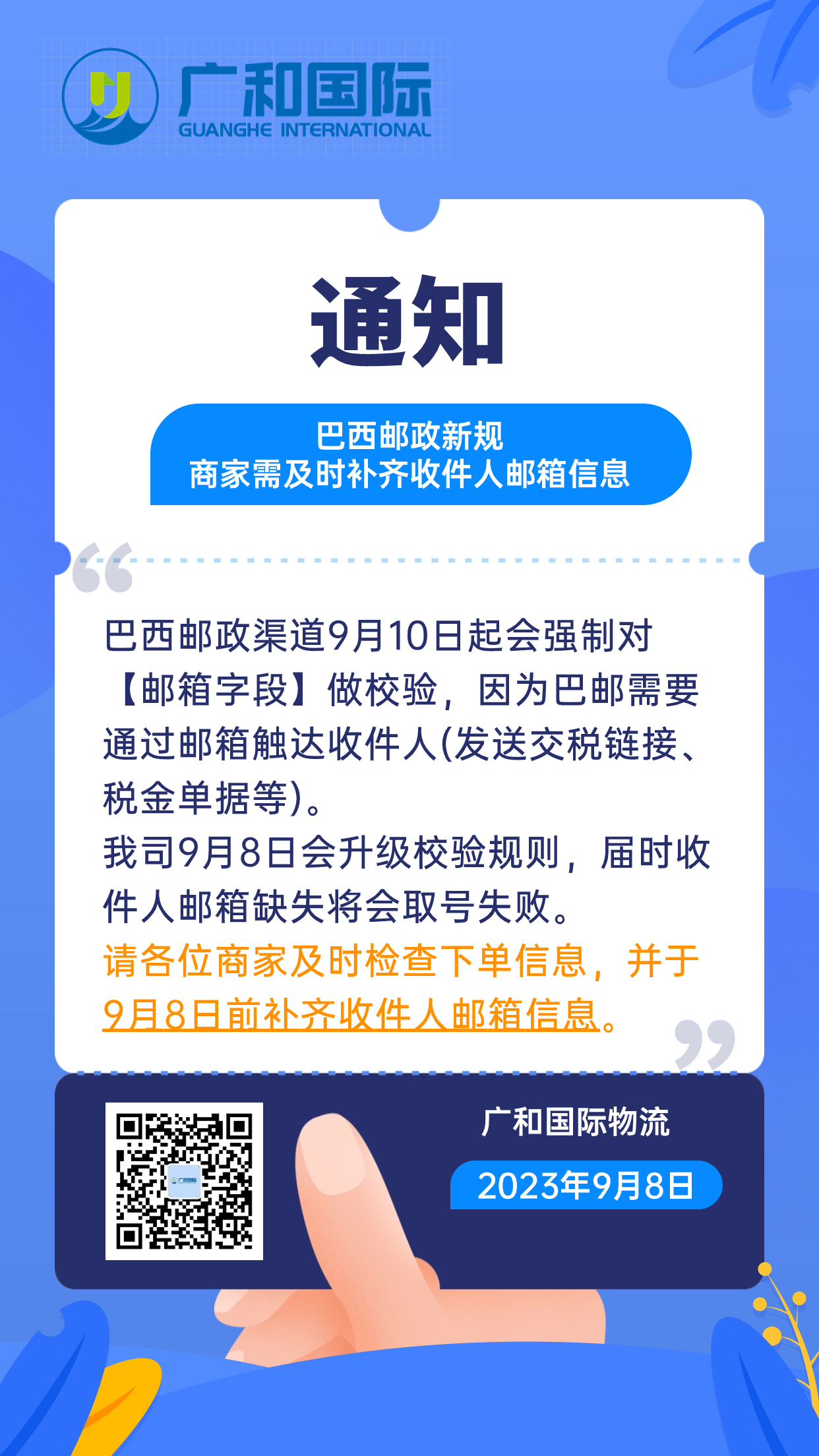 巴西邮政渠道9月10日会强制对 【邮箱字段】做校验,因为巴邮需要通过邮箱触达收件人(发送交税链接、税金单据等),我司9月8日升级校验规则,届时收件人邮箱缺失将会取号失败。请各位商家及时检查下单信息并于9月8日前补齐收件人邮箱信息。