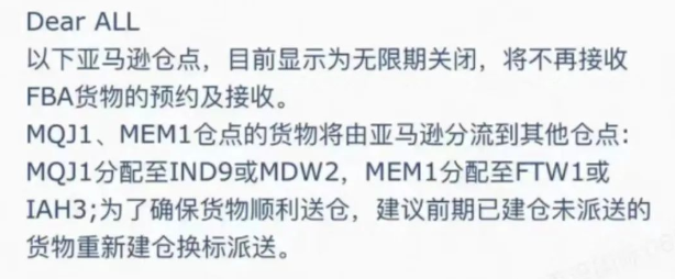QXY8,HMW4,MEM1,MQJ1以上4个亚马逊仓,Amazon 官方通知已关仓。