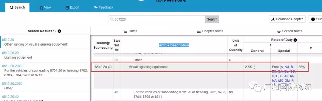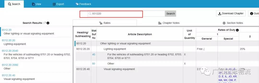 例如我们的产品是车灯,则对应的是8512.20.40这个编码: