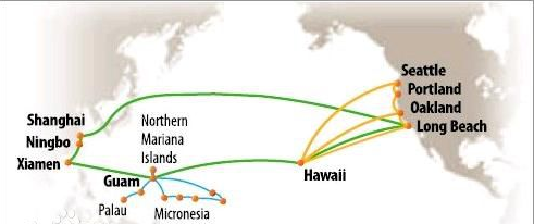 美森(Matson)2005年中国开辟的第一条中美航线(CLX1),长度:214米,速度 23节,最大载量:30000吨,标准箱:2378箱,目前挂靠:厦门-宁波-上海-洛杉矶!