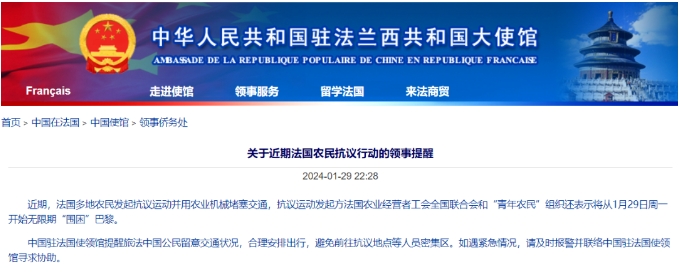 近期,法国各地农民发起抗议运动,并通过农业机械封锁交通。法国农业经营者工会全国联合会和“青年农民”组织宣布,将于1月29日开始无限期“围困”巴黎。对此,中国驻法国使馆发布提醒,提醒旅法中国公民留意交通状况,合理安排出行,避免前往抗议地点等人员密集区。