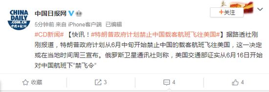 根据中国各航空公司此前发布的6月份航班计划,该命令将影响国航运营的北京-洛杉矶航线、南航运营的广州-洛杉矶航线、东航运营的上海-纽约航线等多条航线。