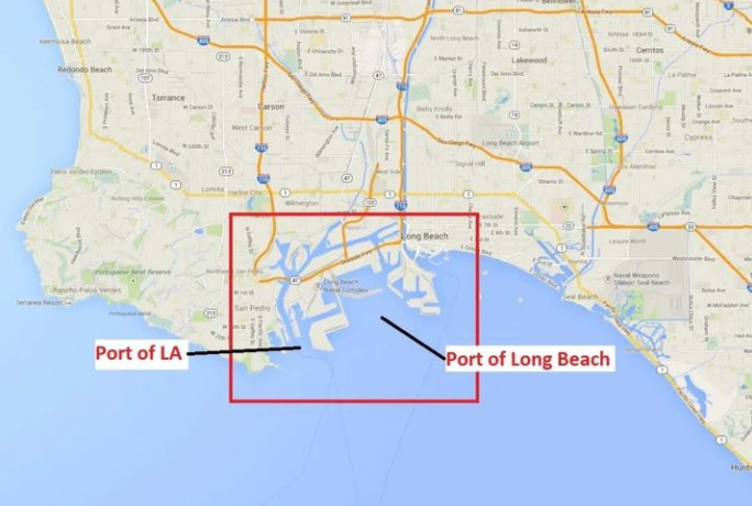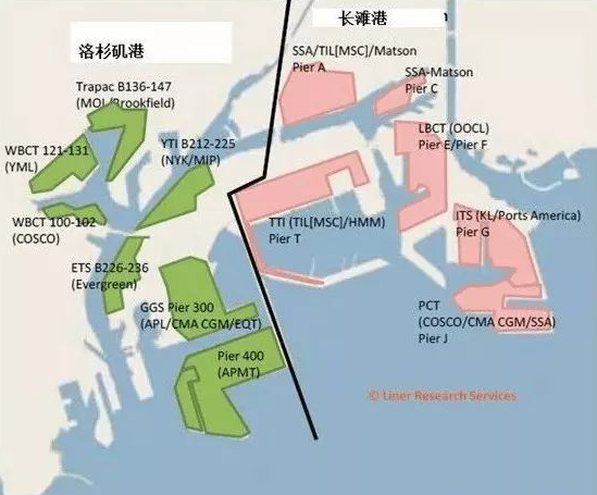 这两个港口相差10公里,和盐田,蛇口港口一样的。总共是13个码头,LB是6个码头,LA是7个码头