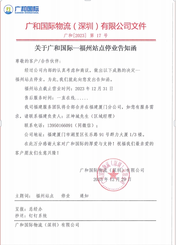 关于广和国际—福州站点停业告知函