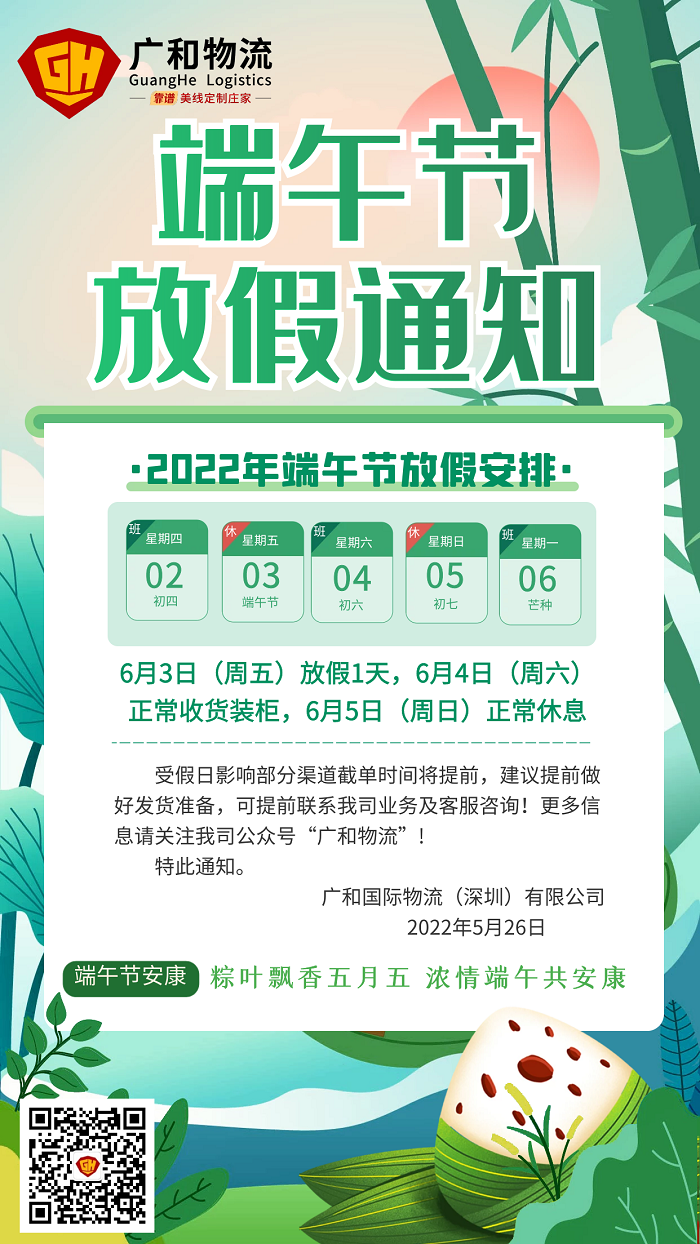 根据《国务院办公厅关于2022年部分节假日安排的通知》中的相关规定并结合公司的实际情况,现将我司2022年端午节放假安排通知如下: