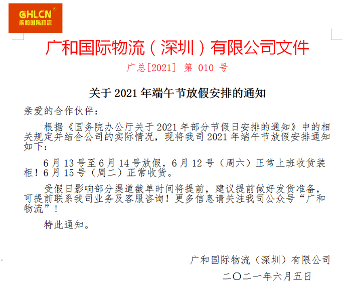 亲爱的合作伙伴们: 我司端午放假时间6月13日至14日,6月12日(周六)正常上班。 受假日影响部分渠道截单时间将提前,建议提前做好发货准备, 可提前联系我司业务及客服咨询!更多信息请关注我司公众号“广和物流”!