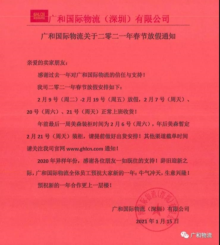 感谢过去一年对广和国际物流的信任与支持!我司二零二一年春节放假安排如下: