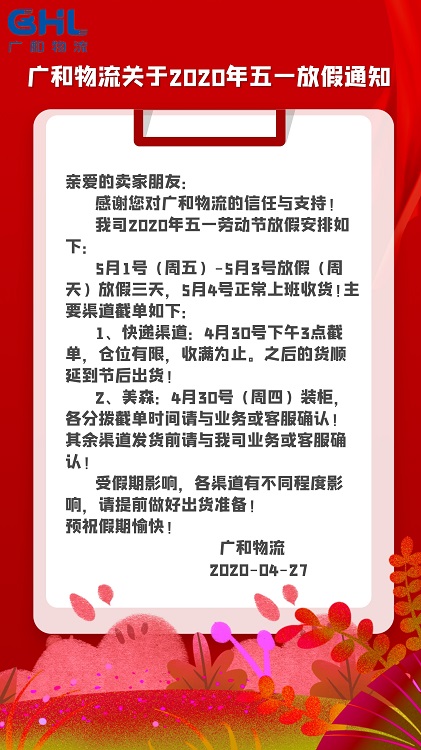 5月1号(周五)-5月3号放假(周天)放假三天,5月4号正常上班收货!主要渠道截单如下: