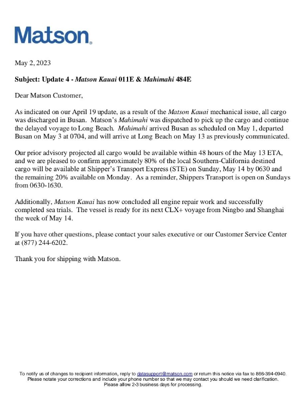 据悉,继4月20关于美森船的更新所述,美森考艾轮011E因机械故障,所装集装箱货物已全部卸在釜山港。美森派往釜山的美森梅茜轮484E已于5月1日按时抵达,在装上所有美森考艾轮所卸货物后,于5月3日一早离开釜山驶往美国长滩港,预计抵港时间为5月13日。