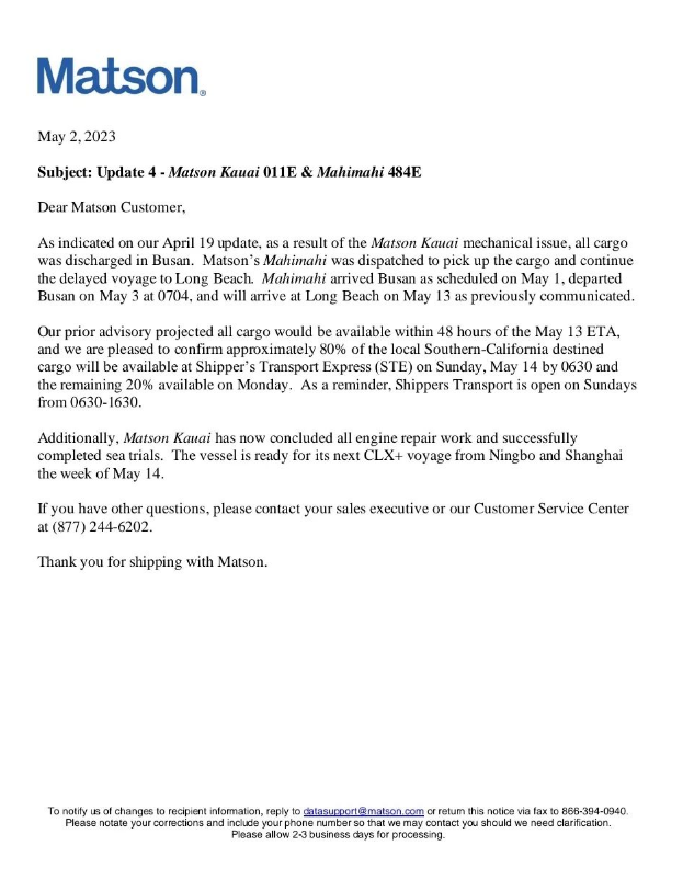 Within 48 hours after the ship arrives at Changtan Port, all containers will be ready for pick-up. The current pickup status is as follows: At 6:30 am on Sunday, May 14th, approximately 80% of the containers on board can be picked up at the off port storage yard (STE), and the remaining 20% of the containers will be picked up on Monday morning, May 15th. Among them, it is particularly important to note that the opening hours of the Outside Port Storage Yard (STE) on Sundays are from 6:30am to 4:30pm.